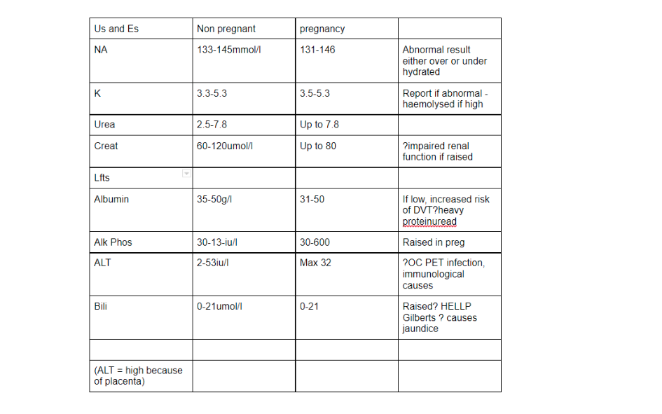 Blood values for pregnancy - this is most relevant to screening for pre-eclampsia.